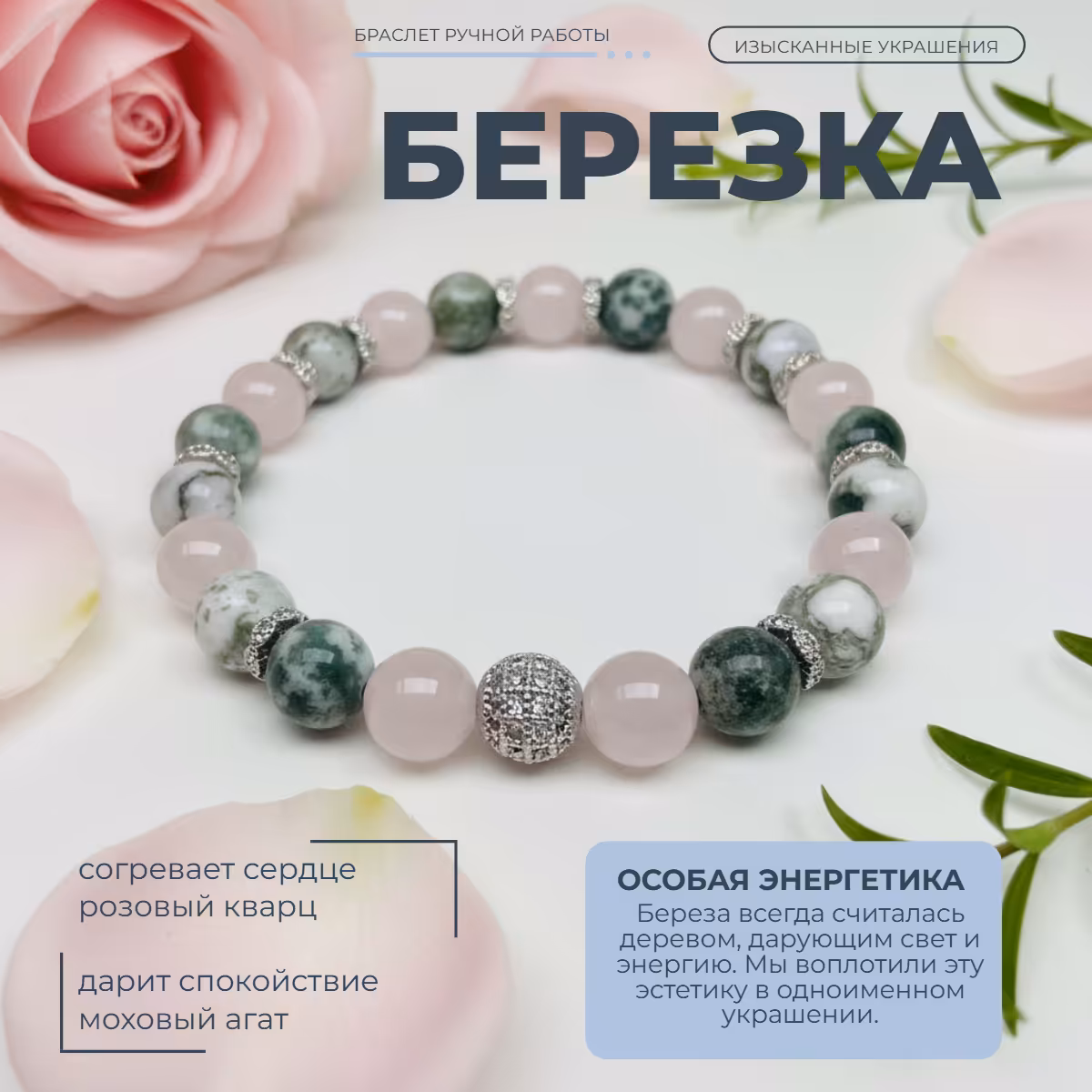 Лаконичное украшение, вобравшее в себя эстетику светлого леса. Сочетание нежного розового кварца и фактурного мохового агата напоминает игру утренних бликов на белоснежных стволах и свежее дыхание природы.