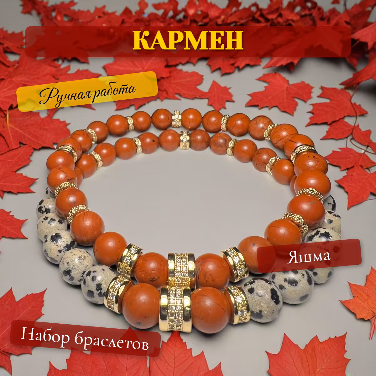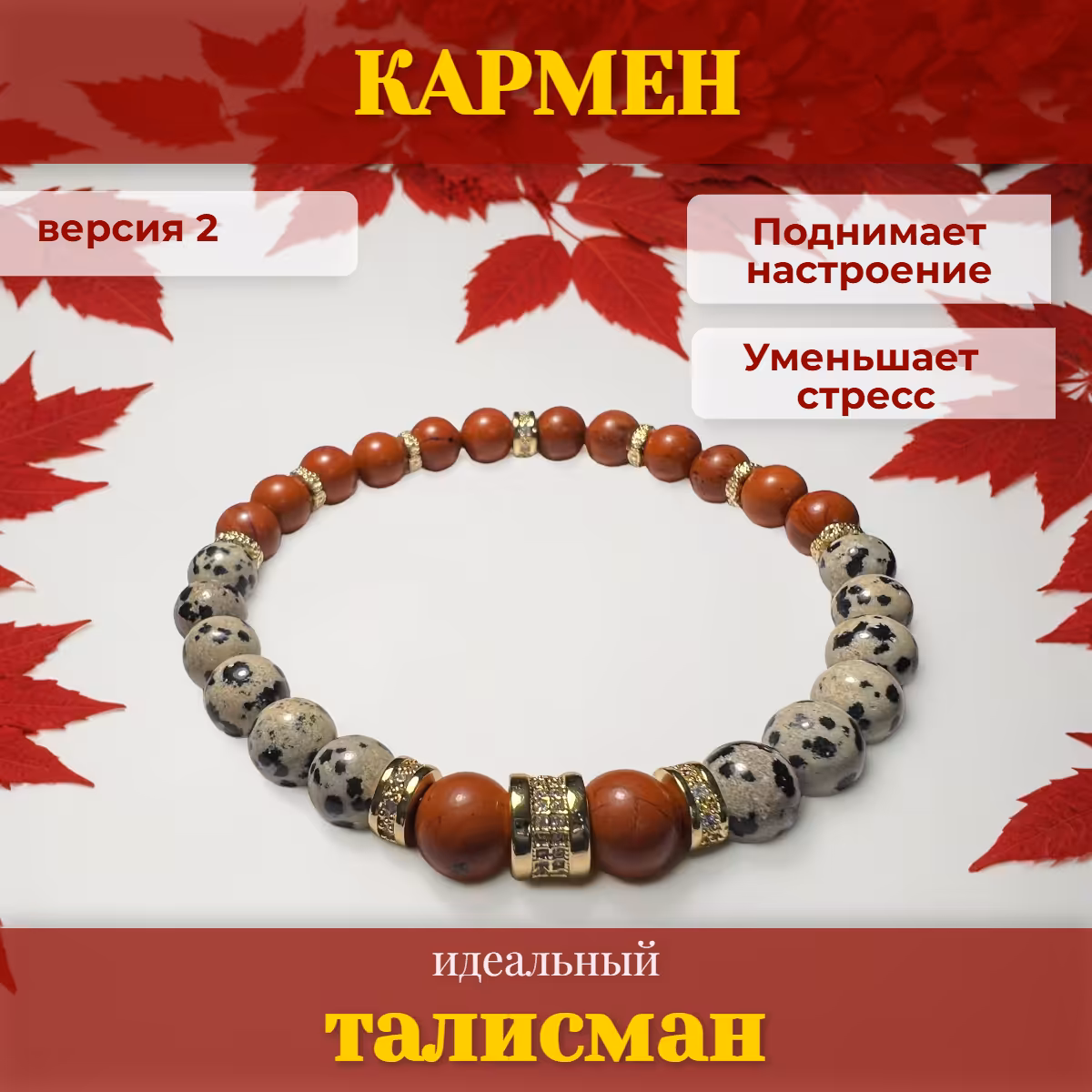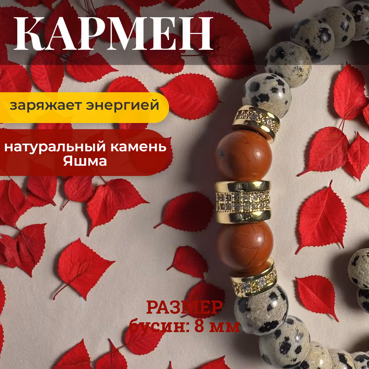 Почувствуйте пульс фламенко и манящую дерзость южных ночей с браслетом «КАРМЕН». Это история контрастов, рассказанная двумя мощными видами Яшмы. Красная Яшма — Огонь: бусины насыщенного красного цвета символизируют страсть, энергию и жизненную силу. Они дарят владельцу уверенность, силу духа и решительность, подобно огненному танцу фламенко. Красная яшма – это ваш внутренний магнит для удачи и смелых свершений. Далматиновая Яшма — Свет: Игривые бусины кремового оттенка с черными пятнышками, привносят легкость, радость и позитив. Она известна как камень, который помогает найти баланс, приносит гармонию и избавляет от негативных мыслей.