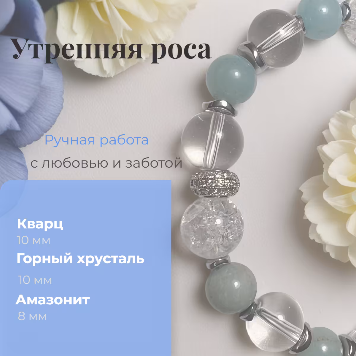 Браслет «Утренняя Роса» – воплощение чистоты и прохлады раннего утра, когда первые лучи солнца играют в капельках росы. Прозрачный, как утренняя влага, Горный Хрусталь дарит ясность мысли, очищает энергетику и усиливает интуицию. Амазонит приносит в жизнь гармонию, умиротворение и ощущение защищенности, поддерживая равновесие души.